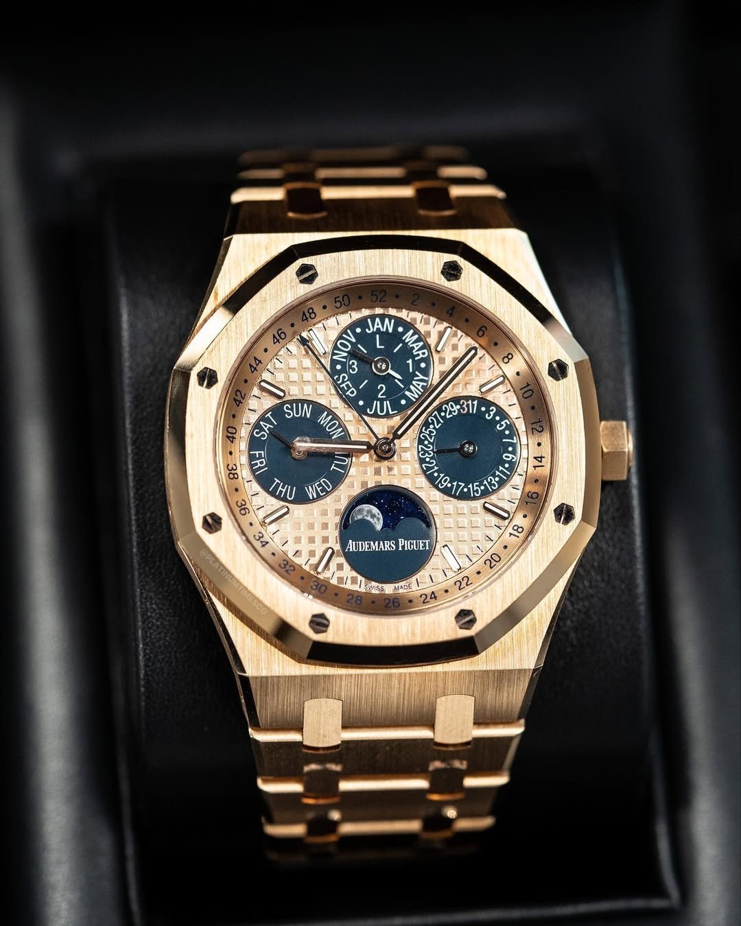 The copper-blue dial adds a distinctive touch, offering rich depth and elegant contrast against the polished case and bracelet. The calendar-style layout enhances both functionality and visual complexity, while the automatic movement design reflects the mechanical heritage that defines the Royal Oak line.