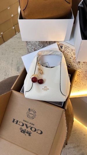 Featuring a structured tote silhouette in tan/brown tones, this bag stands out with its minimal Coach branding and cherry charm detail, adding a subtle luxury statement. The spacious interior and sturdy handles make it perfect for daily use, shopping, or outings.