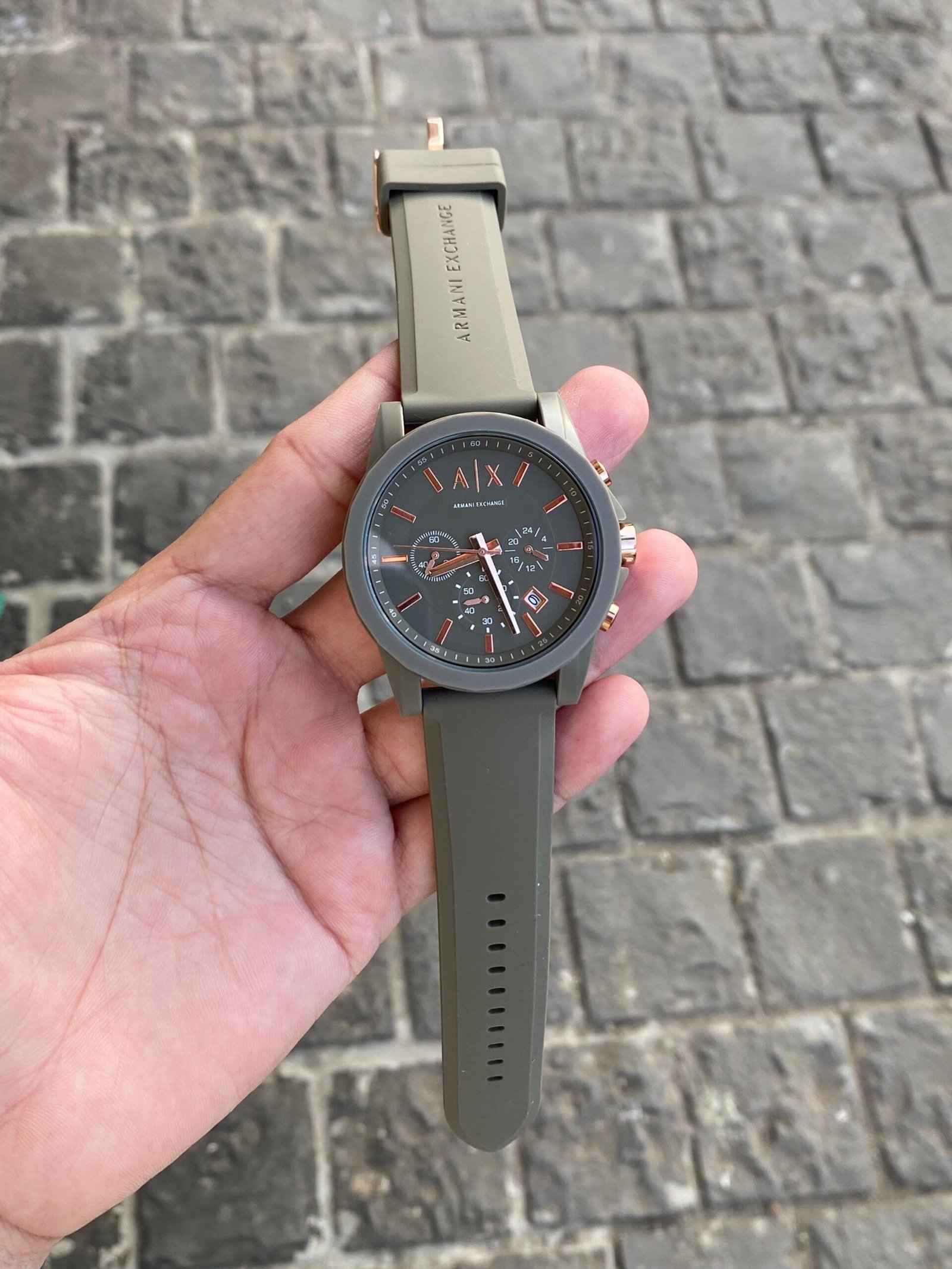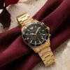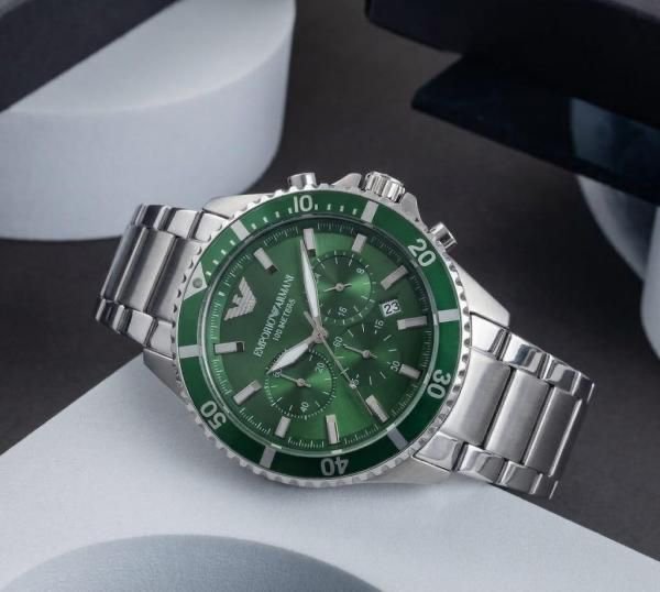 The green dial adds a modern twist while maintaining the clean Armani aesthetic. Chronograph subdials and quartz movement provide functionality and precision for daily wear.
